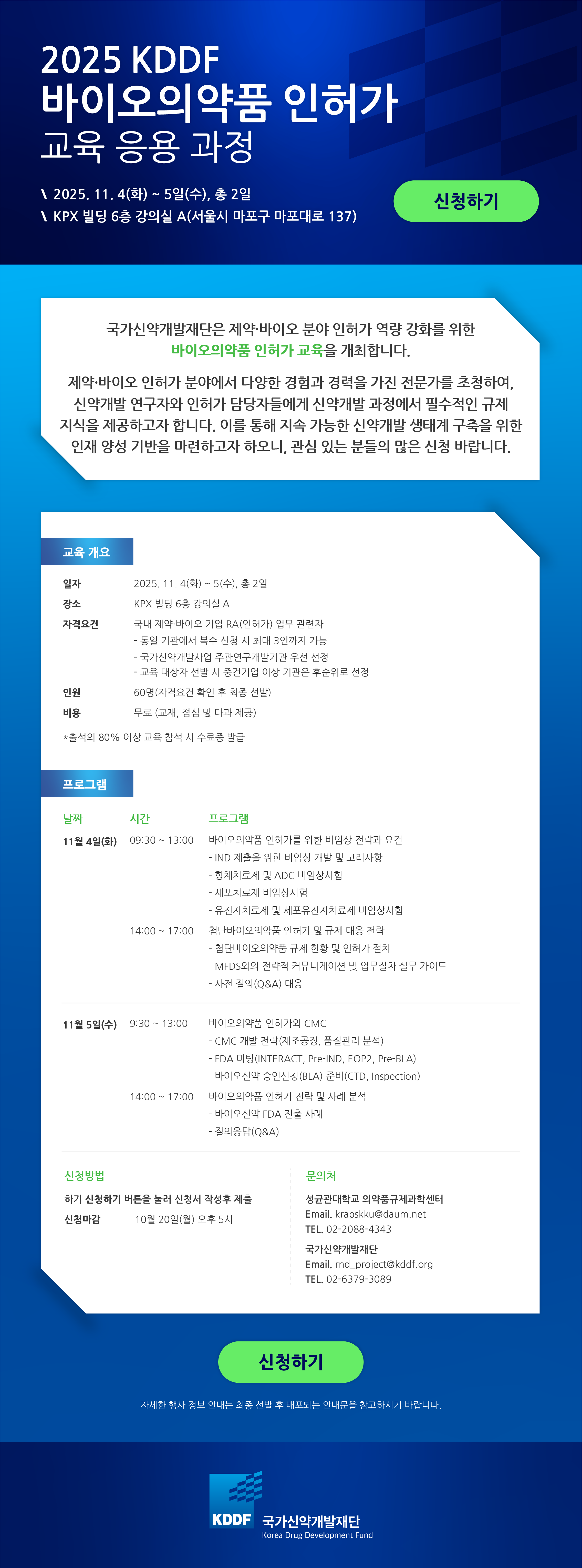 사업공고 [KDDF] 2025 바이오의약품 인허가 교육응용 과정 관리자 2025-09-29 조회수 292 2025 바이오의약품 인허가 교육응용 과정국가신약개발재단은 2025 KDDF 의약품 인허가 교육 프로그램을 추진하고 있습니다.이에 따라 신청 인원 모집 및 프로그램 홍보를 하오니 관심 있는 분들의 많은 참여를 부탁드립니다.신청 접수 기간: 2025.9.29.(월) ~ 10.20.(월) 목록 이전글[한국연구재단] 2025년 한-뉴질랜드 공동연구사업 추진을 위한 연구자 온라인 워크숍 안내 (10/2(목), Zoom미팅) 다음글[보건복지부 보도자료(2025.09.30)] 바이오헬스 투자 시장 활성화 위해 K-바이오·백신 펀드 지속 확대